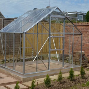 A level foundation of paving slabs is highly recommended, onto which the metal base of the greenhouse (most models) can then be securely bolted. Not only are slabs relatively cheap, and easy to lay down, they also allow surplus water to quickly drain away. Please remember to ensure that the flags overlap the dimensions of the greenhouse frame by at least 18", to allow access for cleaning and maintenance.